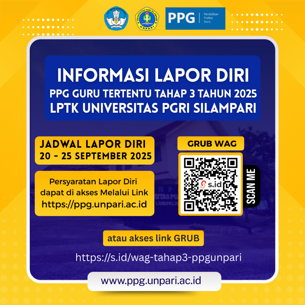 Berdasarkan Surat Kementerian Pendidikan Dasar dan Menengah Direktorat Jenderal Guru Tenaga Kependidikan, dan Kependidikan Guru Nomor 1084/B2/GT.00.08/2025 tentang Pelaksanaan Pendidikan Profesi Guru (PPG) bagi Guru Tertentu (Dalam Jabatan) Tahap 3 Tahun 2025, maka kami informasikan kepada seluruh Calon Mahasiswa PPG Guru Tertentu (Dalam Jabatan) Tahap 3 Tahun 2025 Universitas PGRI Silampari, Bahwa kegiatan Lapor Diri di LPTK sesuai dengan edaran dari GTK Kemdikdasmen akan dilaksanakan atau dibuka pada tanggal 20 – 25 September 2025secara online. Adapun untuk setiap peserta wajib untuk melengkapi persyaratan sebagai berikut :
